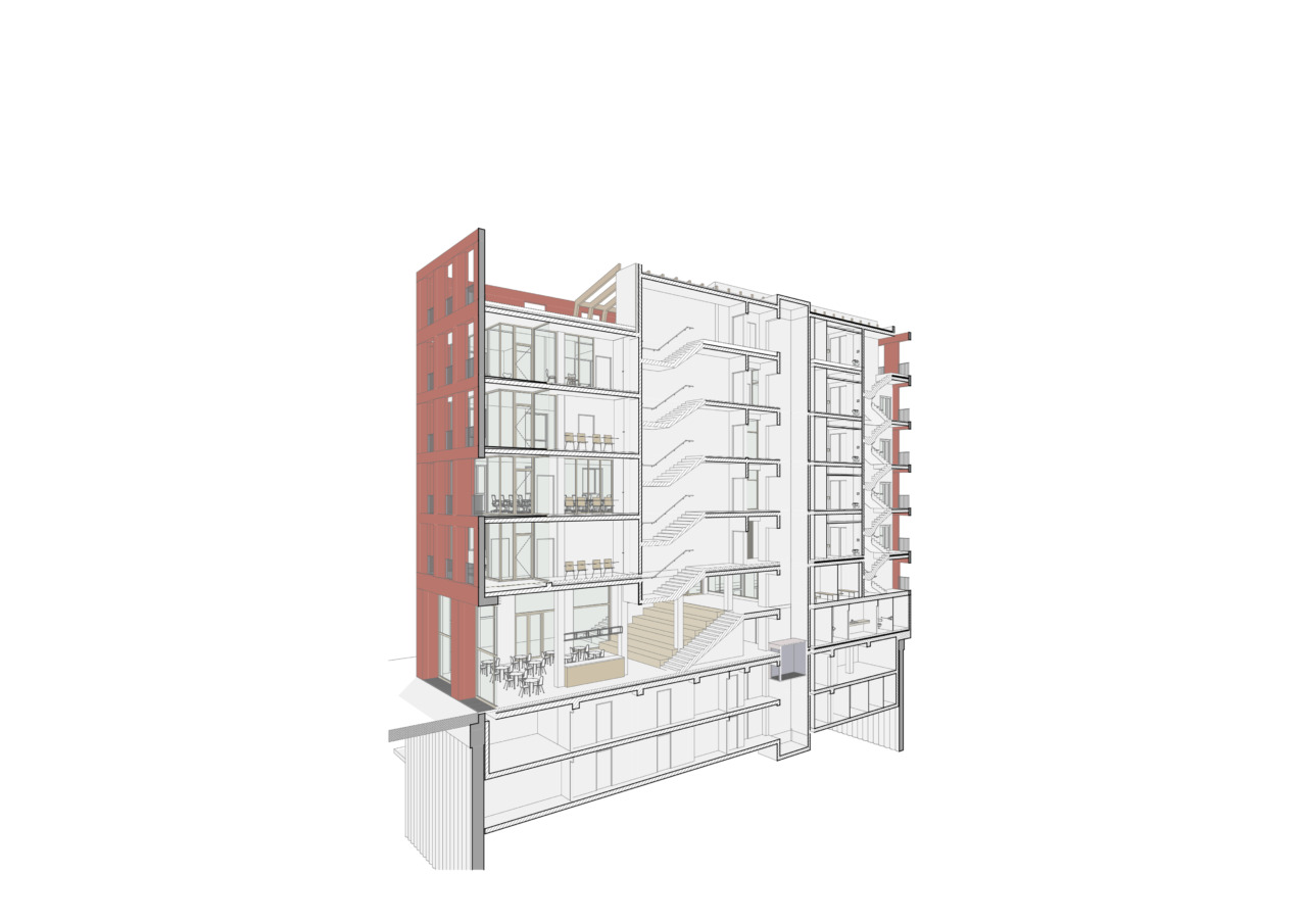 Le projet prend place sur la friche constituée par des bâtiments industriels abandonnés. A proximité, la façade-vestige de l’usine Alban, plus haut l’Antiquarium. Elle est installée en bordure du Cours Napoléon, pour moitié le long de la rue Antoine Sollacaro et prise en tenaille entre l’hôtel en construction et un immeuble de ville XIXème siècle. C’est dans ce cadre que le projet trouve sa place. Il cherchera à participer au processus de renouvellement du territoire tout en s’inscrivant dans une typologie qui caractérise Ajaccio ; tant d’un point de vue de son implantation urbaine que dans son processus de conception et sa matérialité.